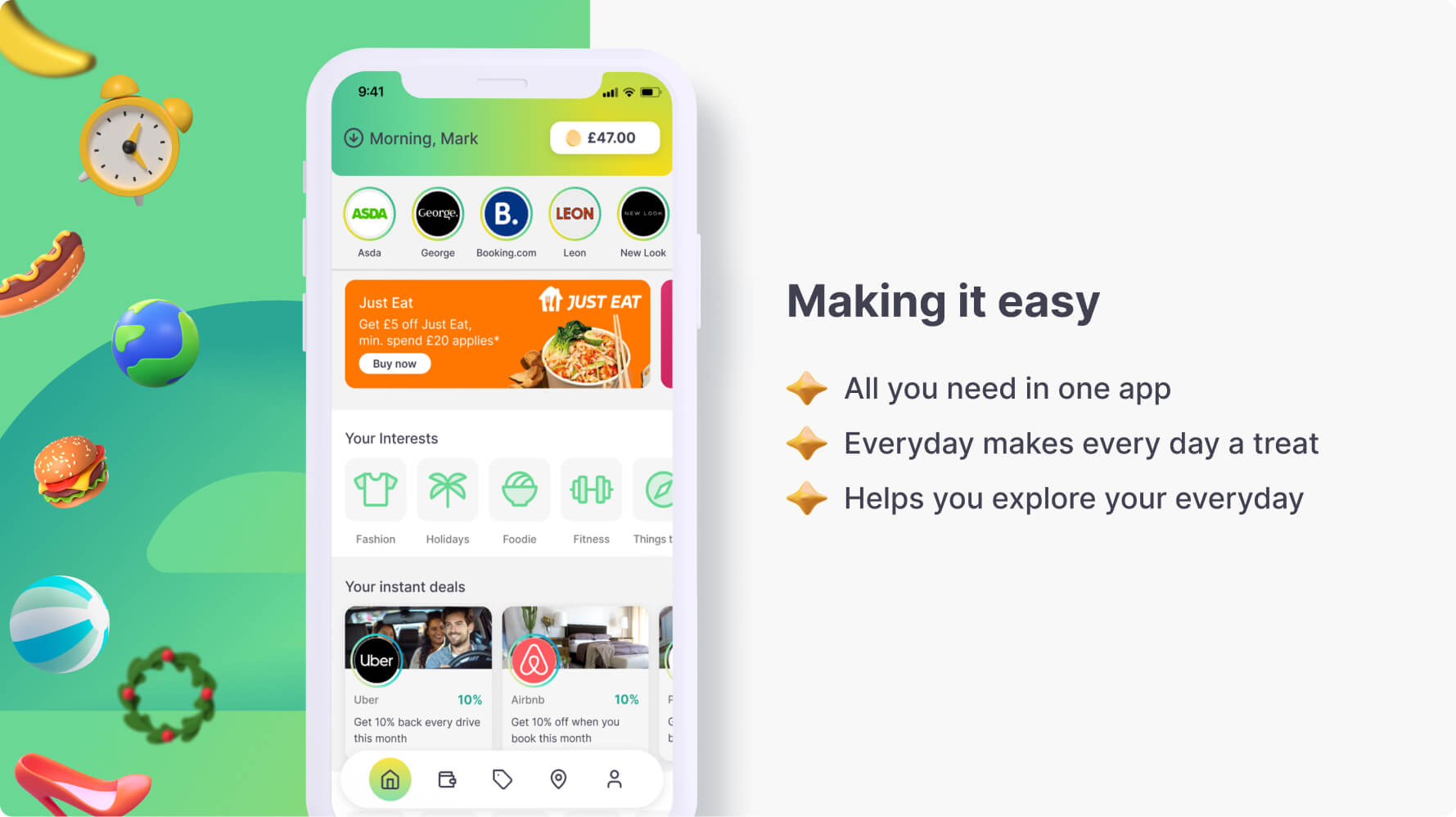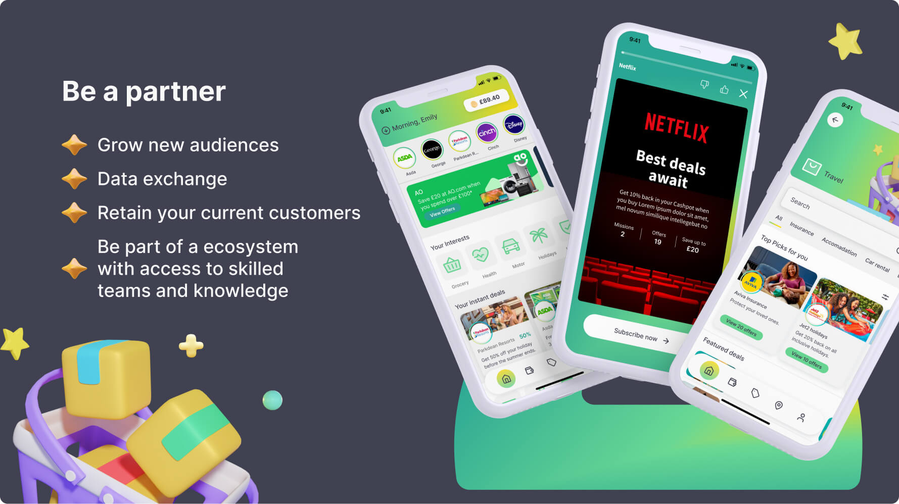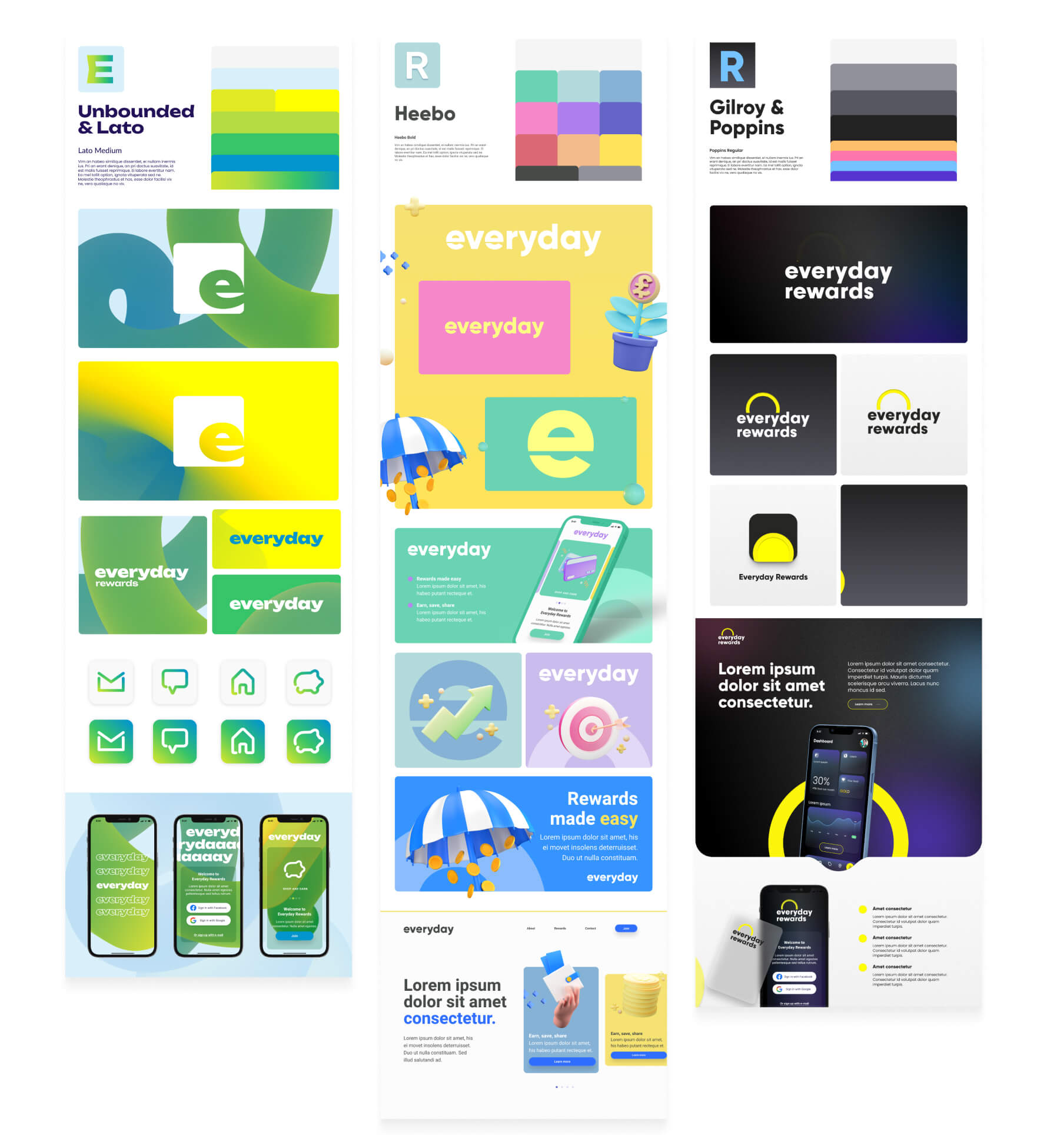 While the overall UX architecture was not considered at this stage, UX thinking remained central to ensure the concept was clear both internally and externally. The key focus being; how an average user would benefit from the app based on their lifestyle, interests, and shopping habits. Additionally, I strategically considered what interests potential partners would have in joining the loyalty ecosystem that Everyday was aiming to create.